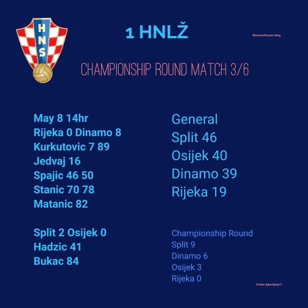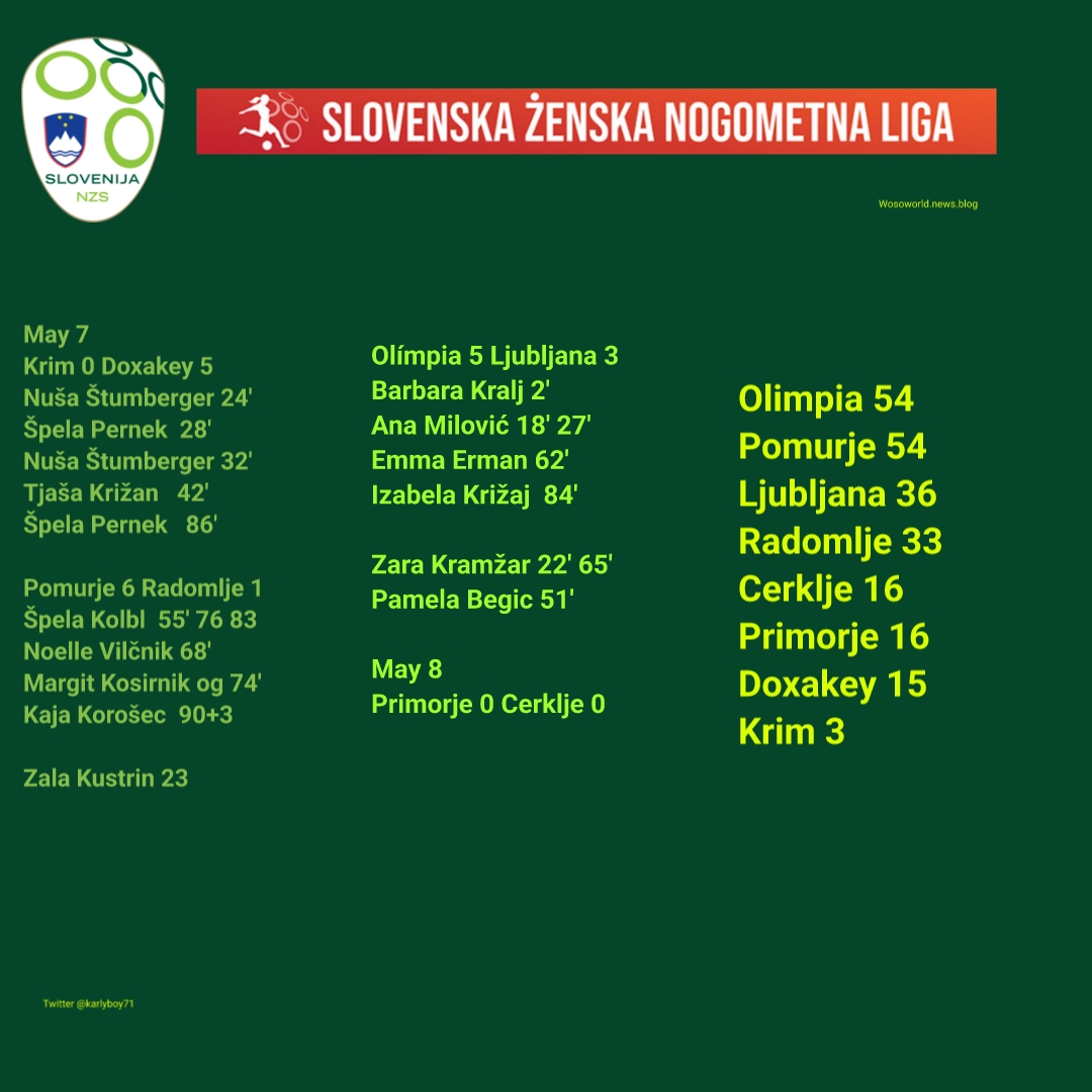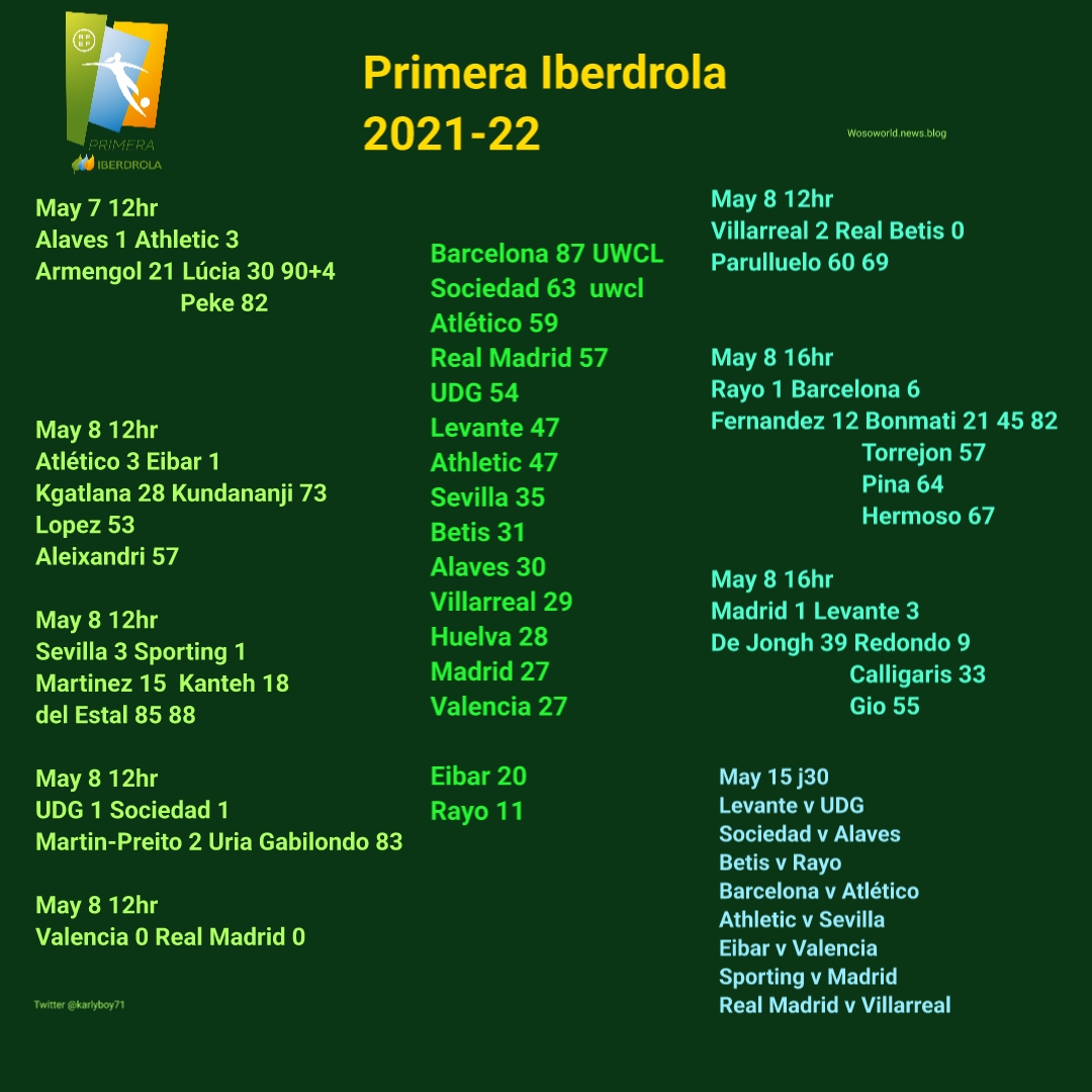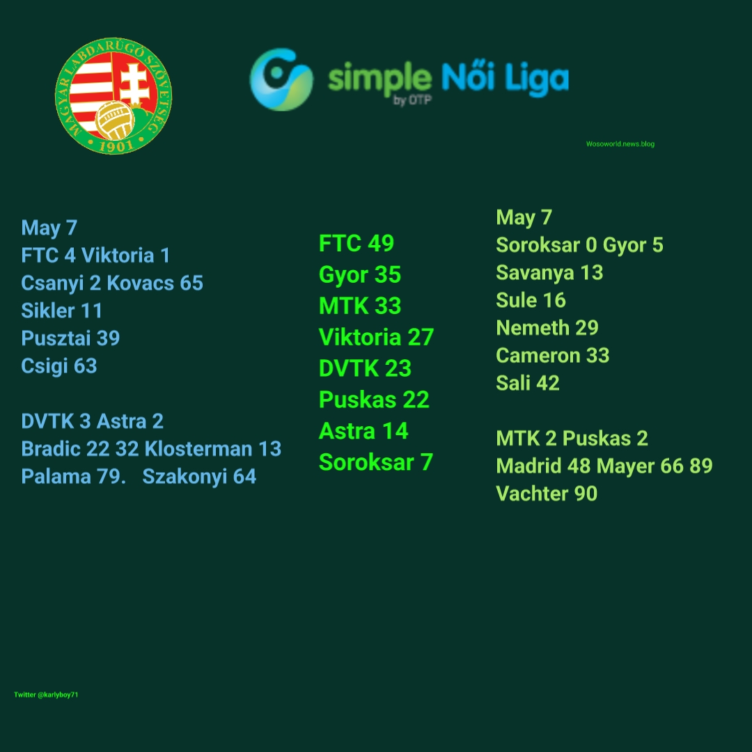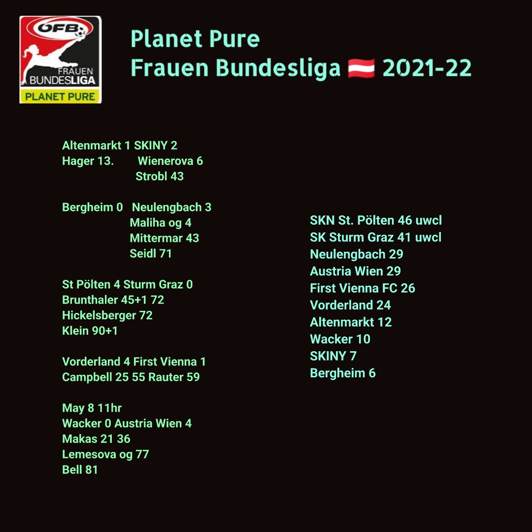 Wolfsburg blitzed relegated Jena 10-1 with a dominating performance as nine different players scored to regain the title from rivals Bayern. Eintracht produced a excellent performance with a stunning goal from Hanshaw to ruin Potsdam’s opportunity of clinching their place in next season’s UWCL. The final position will be taken in next weekend final round when Potsdam travel to Bayern and Eintracht host Werder. Sand kept faint hopes of survival with a 1-0 victory over Koln as Essen lost at Freiburg 3-0.