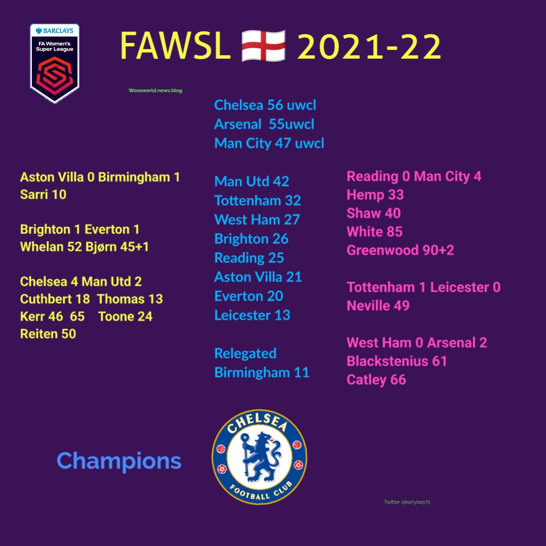 A Sam Kerr second half brace eased the nerves of Chelsea as they retained the title on the final day of the FAWSL season. Trailing 1-2 at the break to Manchester United, early strikes in the second half by Kerr and Reiten put the host on course, Kerr sealed the title with a spectacular 65th minute strike. Second placed Arsenal won 2-0 at West Ham while Manchester City ensured their uwcl place with a 3-0 victory at Reading