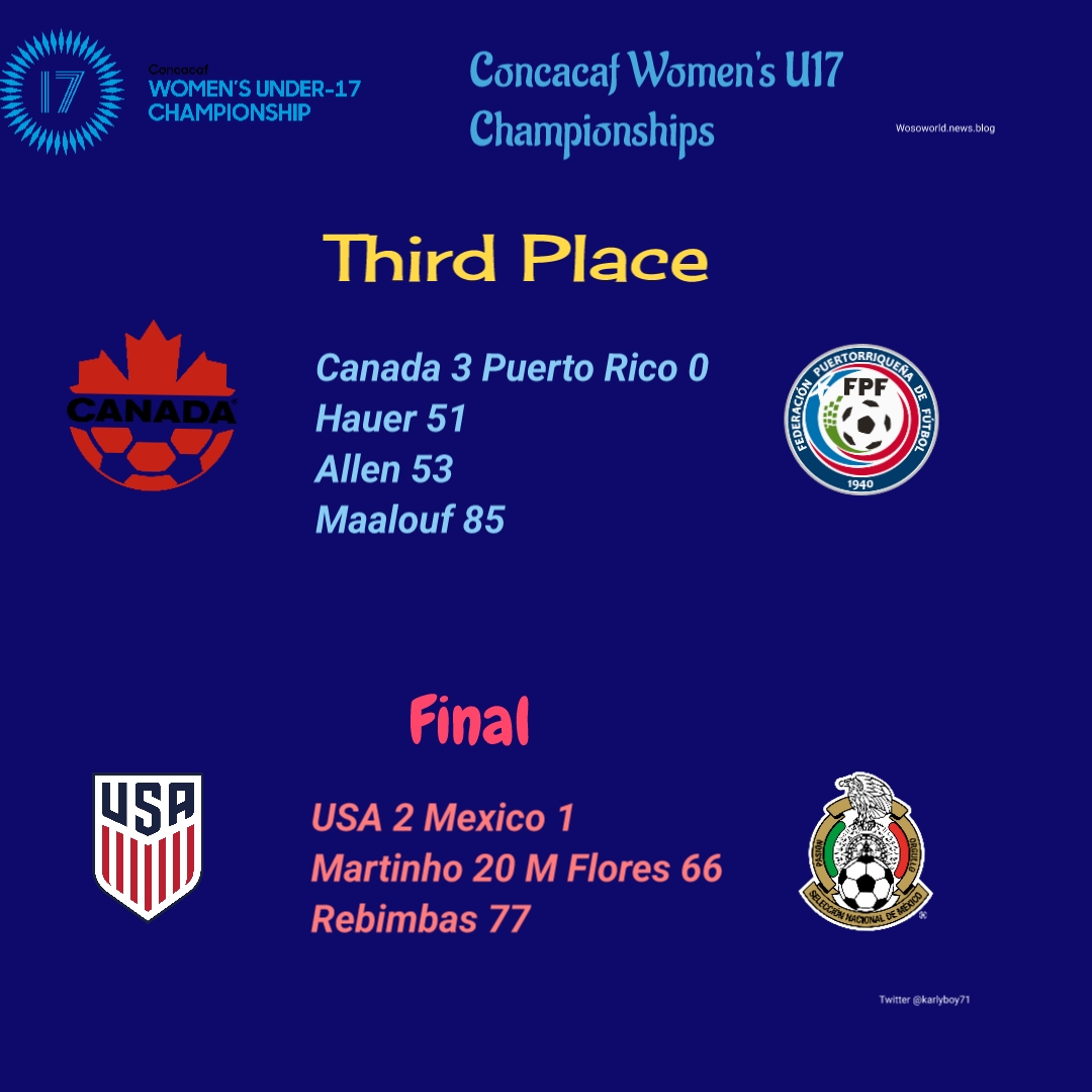 USA won a third consecutive Concacaf Women’s Under 17 Championship defeating Mexico 2-1 in a tightly thought final. Earlier Canada beat Puerto Rico 3-0 to claim their spot in the Fifa Women’s Under 17 World Cup in India.