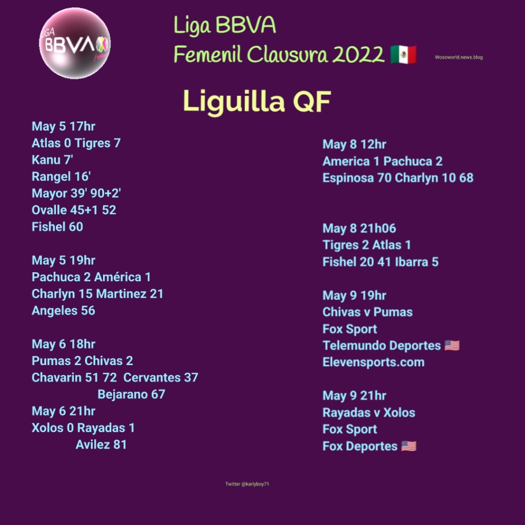 America where eliminated from the Liguilla as Pachuca stunned the host 2-1 for a 4-2 aggregate victory. Tigres defeated Atlas 2-1 courtesy of a Mia Fishel double as they strode to a 9-1 aggregate win.