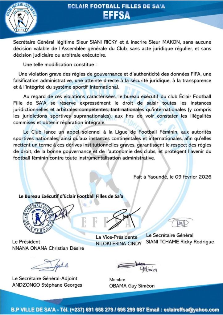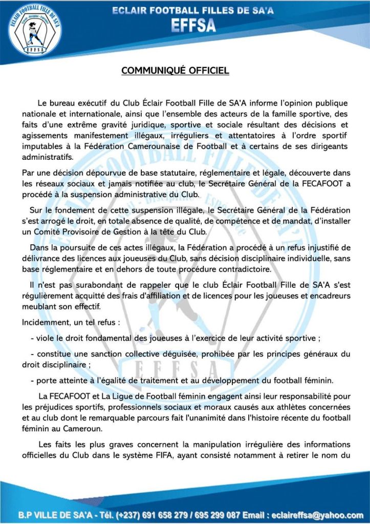 The executive board of the Éclair Football Girls of SA’A Club informs the national and international public, as well as all stakeholders in the sporting community, of extremely serious legal, sporting, and social events resulting from manifestly illegal, irregular, and sporting decisions and actions attributable to the Cameroonian Football Federation and certain of its administrative officials.