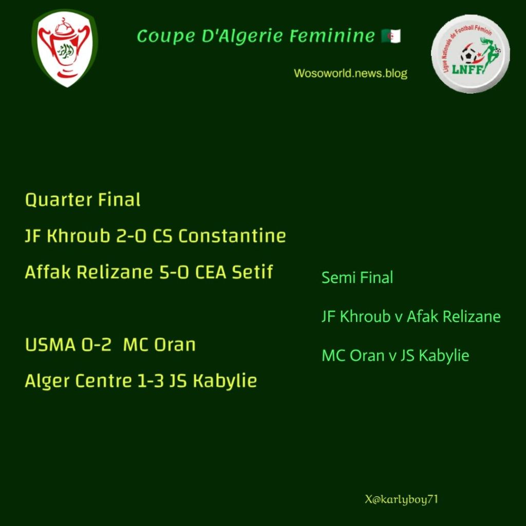 MC Oran advanced to the Semi Final to face defending holders JS Kabylie after defeating UMSA 2-0. Kabylie advanced beating Alger Centre 3-1 with Nadia Ioueneughene scoring a brace. JF Khroub will face Affak Relizane in the second semi final.