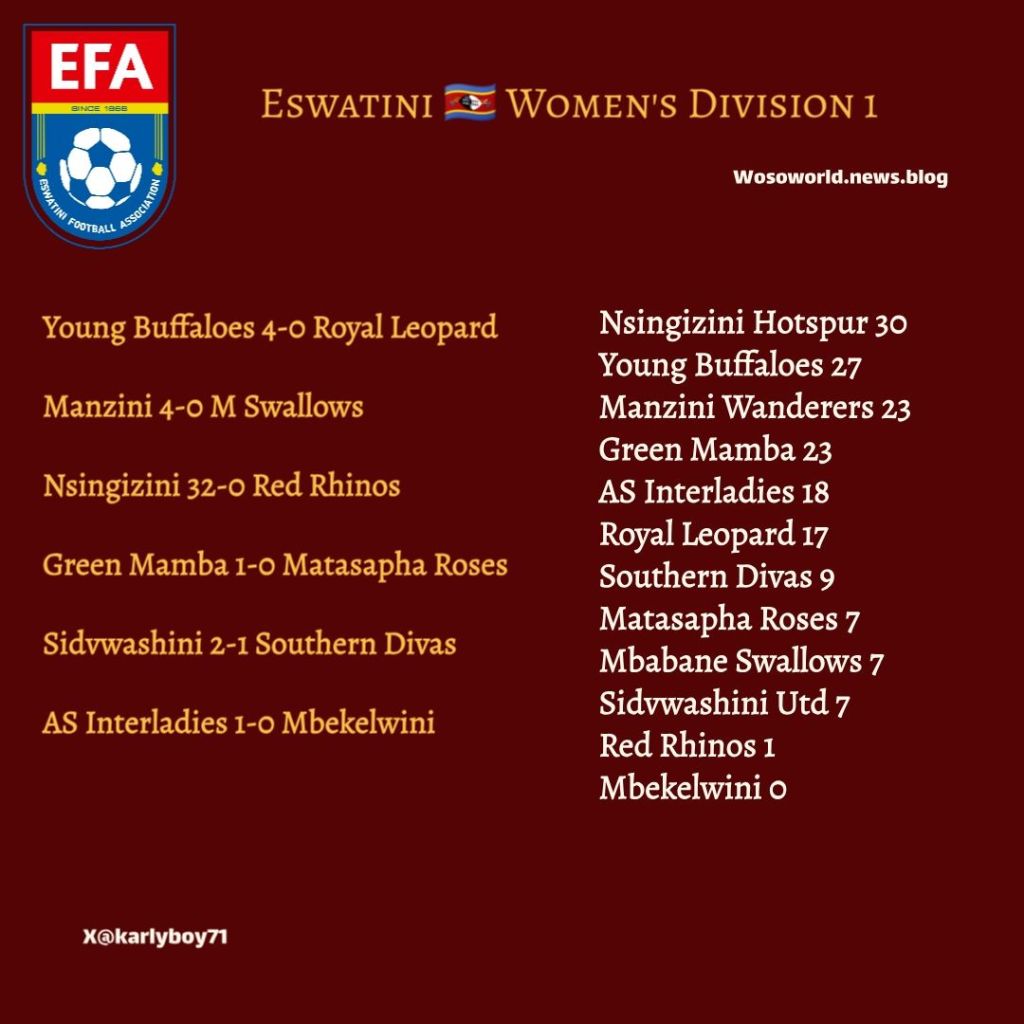 Leaders Nsingizini Hotspur demolished Red Rhinos 32-0 to remain top in Eswatini with a 100% record through ten rounds. Young Buffaloes defeated Royal Leopard 4-0 to stay 3 pts adrift.