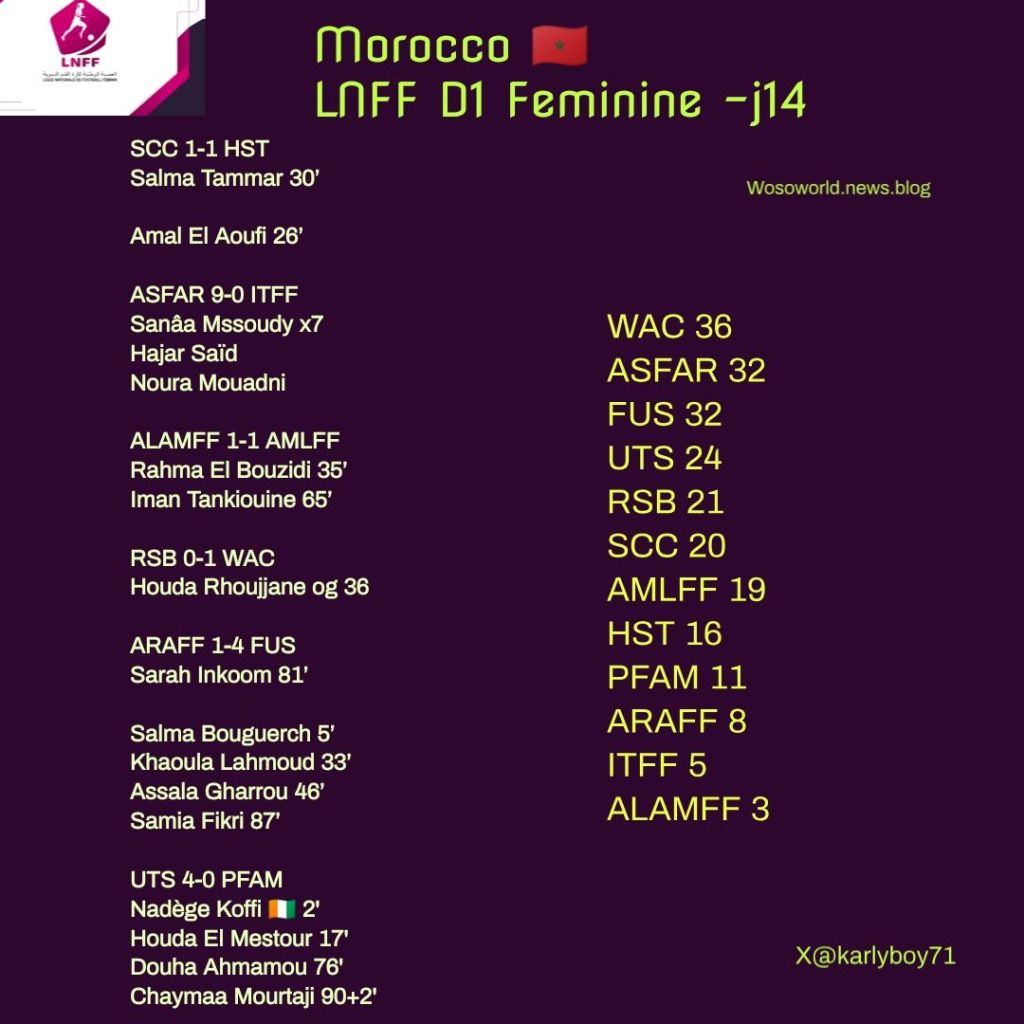ASFAR returned to domestic activities following their participation in the Fifa Women’s Champions Cup by thrashing ITFF 9-0, of which Sanaa Mssoudy struck 7 including 3 from the penalty spot. They remain 4pts adrift of WAC with two games in hand as the leaders edged RS Berkane 1-0 courtesy of a Houda Rhoujjane own goal. FUS dominated ARAFF 4-1 to remain third.