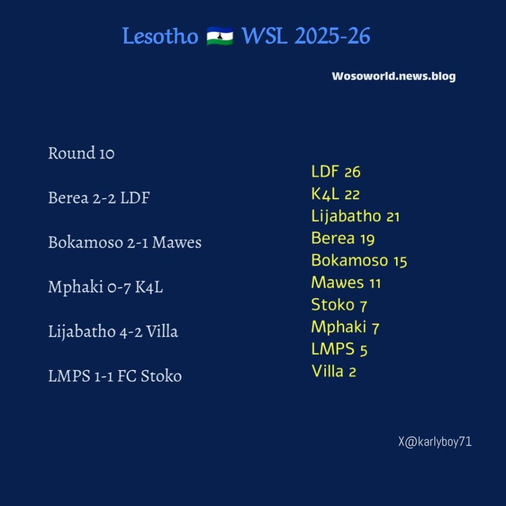 Berea held leaders LDF Ladies to a 2-2 draw in round 10 action in Lesotho, defending champions Kick 4 Life cut the gap at the top to 4pts with a 7-0 win over Mphaki.