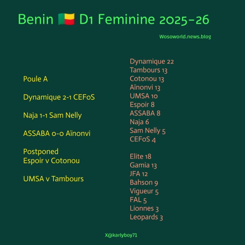 Gloria Zanmenou hit a 69th minute winner as Dynamique defeated CEFoS 2-1 and continue their dominance of Poule A extending the lead to 9pts with Tambours and Cotonou having their games postponed. Struggling reigning champions drew 1-1 with Naja and remain second bottom in the poule.