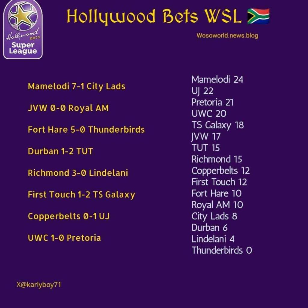 Midweek action in South Africa saw leaders Mamelodi crush City Lads 7-1 , UJ moved into second position as they defeated Copperbelts 1-0 and UWC moved up to the fourth spot beating Pretoria 1-0 .