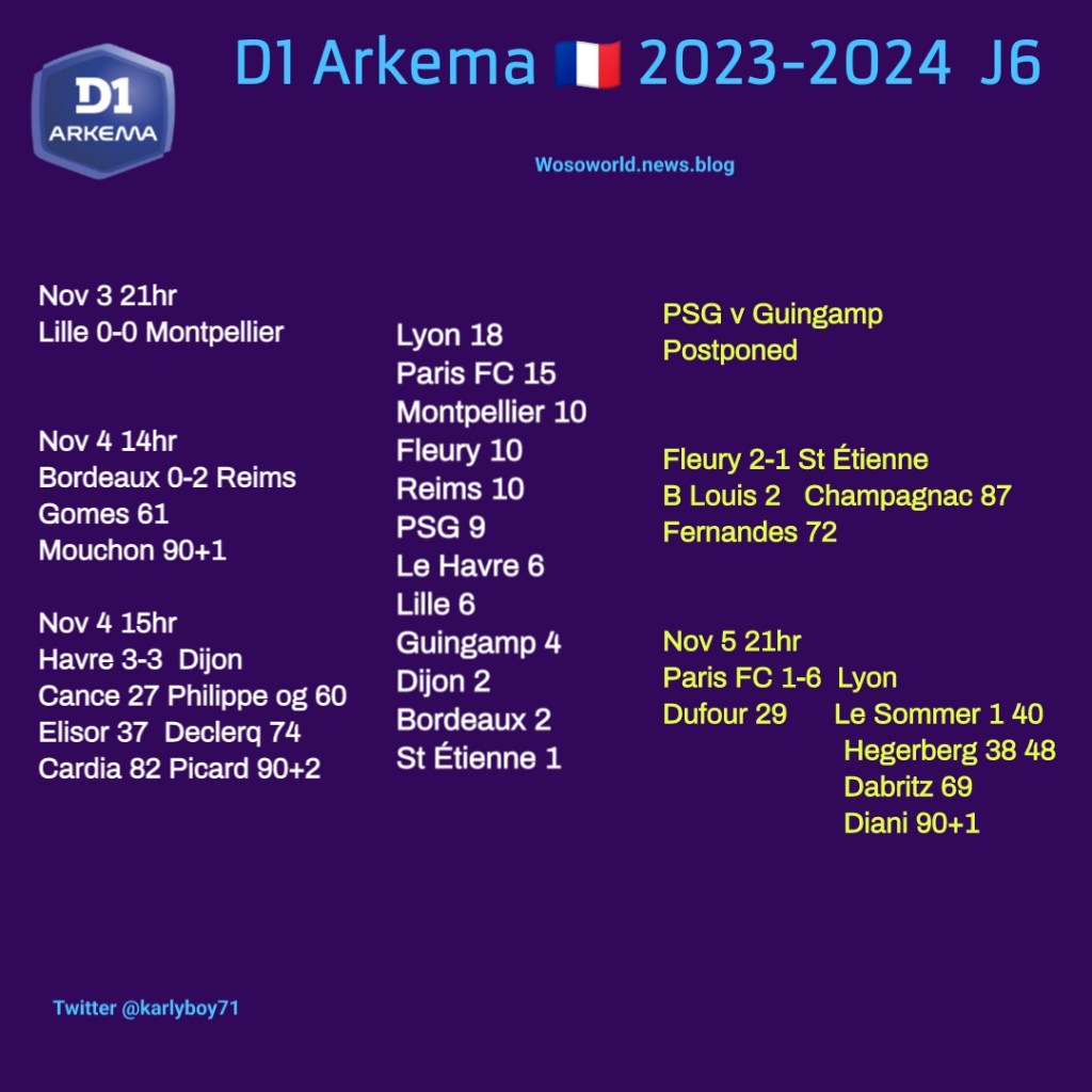 Lyon served notice to upcoming European opponents dismantling Paris FC 6-1 at Charlety. A brace from Le Sommer the second a stunning volley along with Ada Hegerberg with two, Sara Dabritz and a Kadi Diani stoppage time goal to round of the rout. Montpellier had to settle for a point at Lille in a goalless encounter, with Reims and Fleury earning victories to move to 10pts at Bordeaux and over St Etienne respectively. PSG had their game against Guingamp postponed a hour before the game due to pitch conditions.