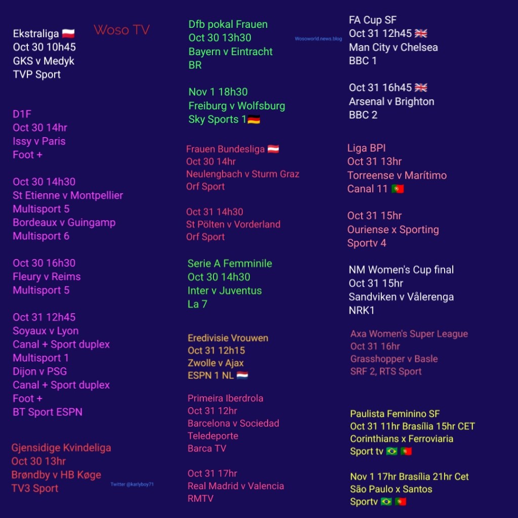 Women’s Football tv Oct 30 to Nov 1