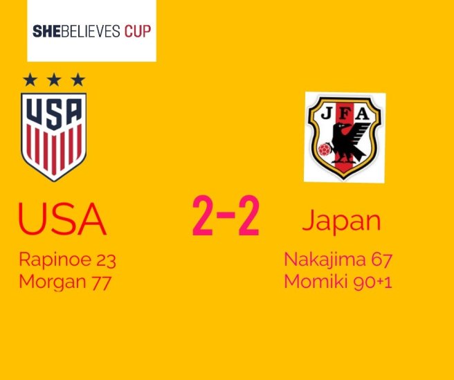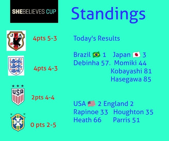 Womens international results. Japan beat Brazil 3-1 and England hold USA to a 2-2 draw in the She Believes Cup ACTION. All of the results today below 2nd March 2019 ~ rothwellk2701 ~ Leave a comment