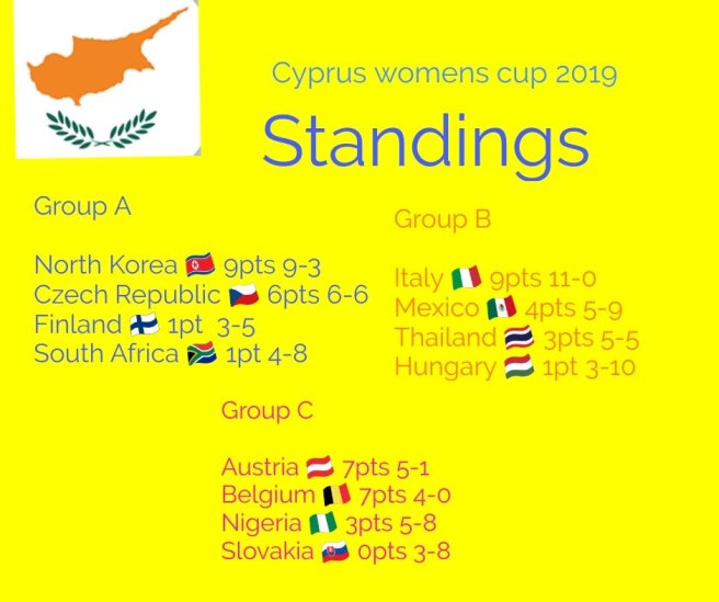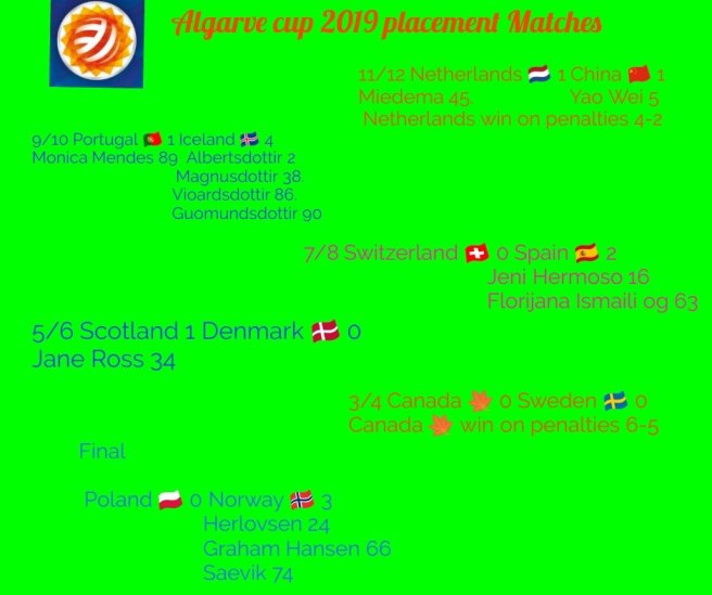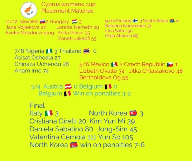 Womens internationals North Korea win the Cyprus womens cup with a dramatic 7-6 penalty shoot out win over Italy following a 3-3 draw. Norway won the 2019 Algarve Cup defeating Poland 3-0 in the Final. All today’s placement match results below 6th March 2019 ~ rothwellk2701 ~ Leave a comment